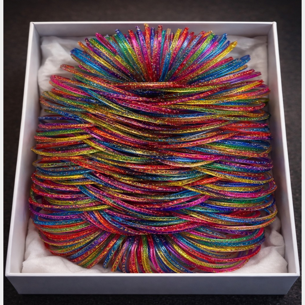 This beautiful set of Raindrop Glass Bangles comes in vibrant shades like pink, blue, green, purple, and gold — all finished with a soft glitter shine that looks stunning in daylight and evening lights. The raindrop texture gives them a unique sparkle that stands out without being too heavy.